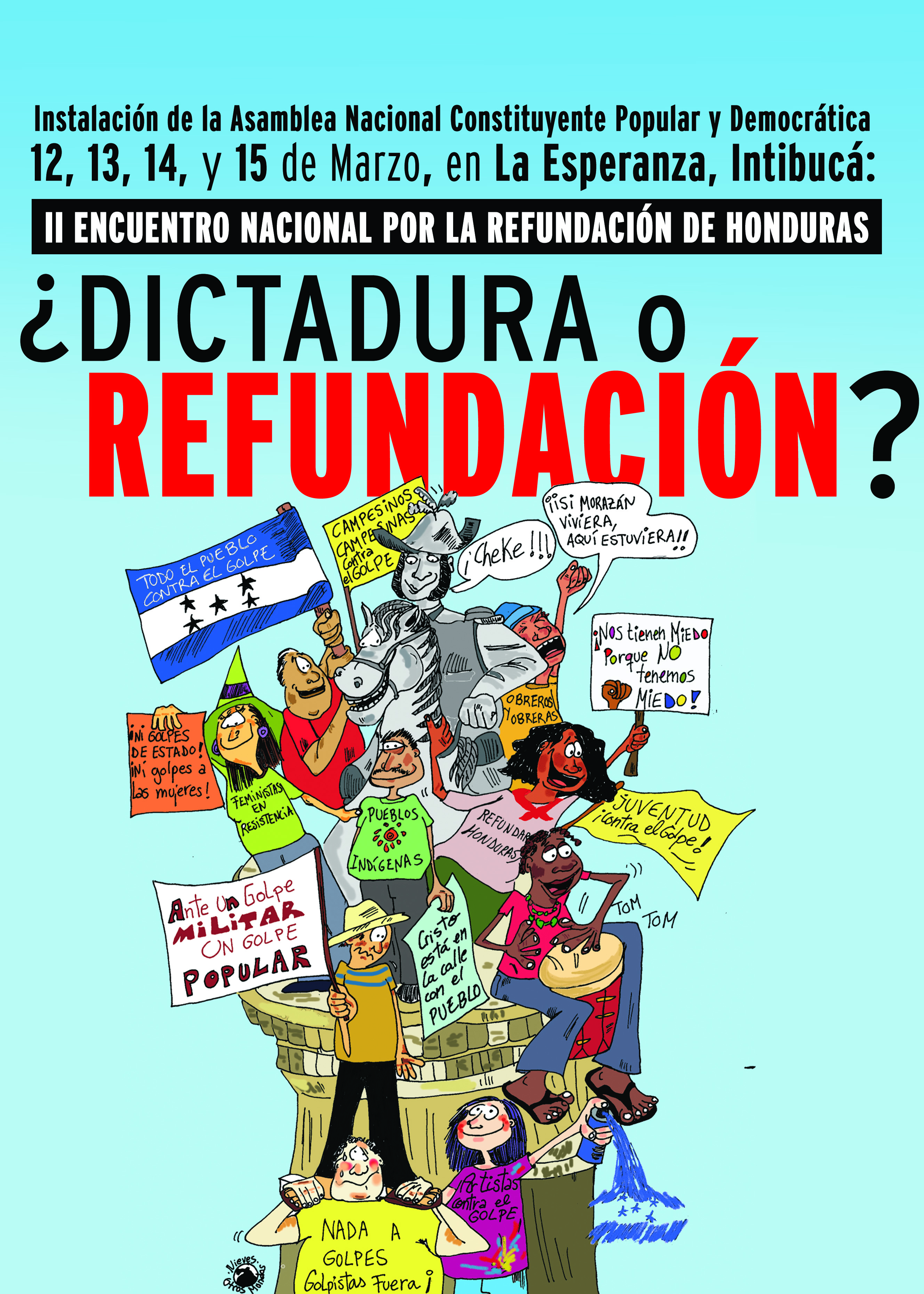 En este contexto y en respuesta a la violenta ruptura del orden constitucional e institucional ejecutado a través del golpe de estado del 28 de junio, surge el movimiento de resistencia popular contra el golpe de estado, aglutinado en el Frente Nacional de Resistencia Popular. Una fuerza espontánea, con representaciones organizativas, pero con una multiplicidad de actores sociales, con una diversidad de pensamientos y prácticas trabajando juntos, de una manera desconocida en el panorama nacional. Esta fuerza ha tenido diferentes momentos de incidencia sostenidos por la movilización ininterrumpida. Hasta el proceso electoral, el liderazgo del presidente Manuel Zelaya determinó en gran medida las rutas del frente. Sin embargo hay iniciativas colectivas que estamos organizando nuestros caminos en forma autónoma hacia un planteamiento más profundo que la lucha contra el golpe: la refundación de Honduras.