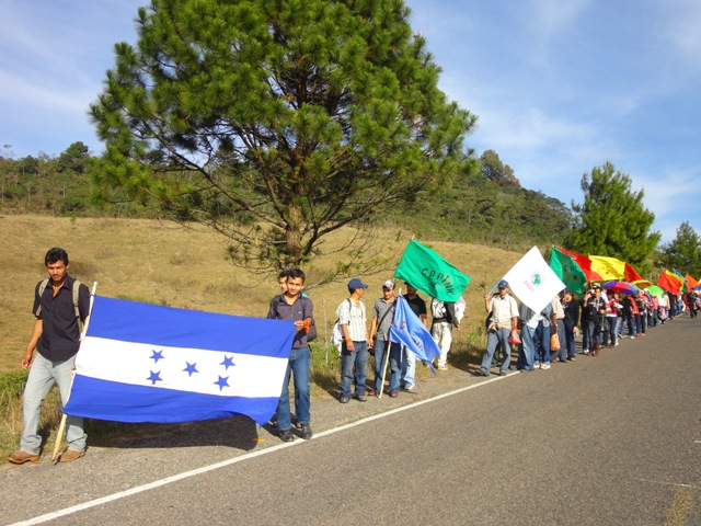 El COPINH con sus luchas contra las represas que amenazan los hermosos ríos de Lempira, Intibucá y La Paz, contra los proyectos que tratan de quitar los bosques a las comunidades, contra el racismo que se empeña con acabar con la vida comunitaria lenca afianzada en territorios sostenidos con la fuerza ancestral de su gente, es convocante a la caminata donde cientos de hondureños y hondureñas van andando para mostrar que ante la poderosa y millonaria maquinaria de la muerte que aceitó el golpe de estado, que seguimos en resistencia nacional. Caminamos con el resto de la población que se va sumando en cada lugar para que la gente nos mire y para mirarnos, sentir que no acabarán así nomás con nuestras ganas de vivir en justicia y dignidad, que no se termina en un proceso electoral manoseado, las aspiraciones de los pueblos.