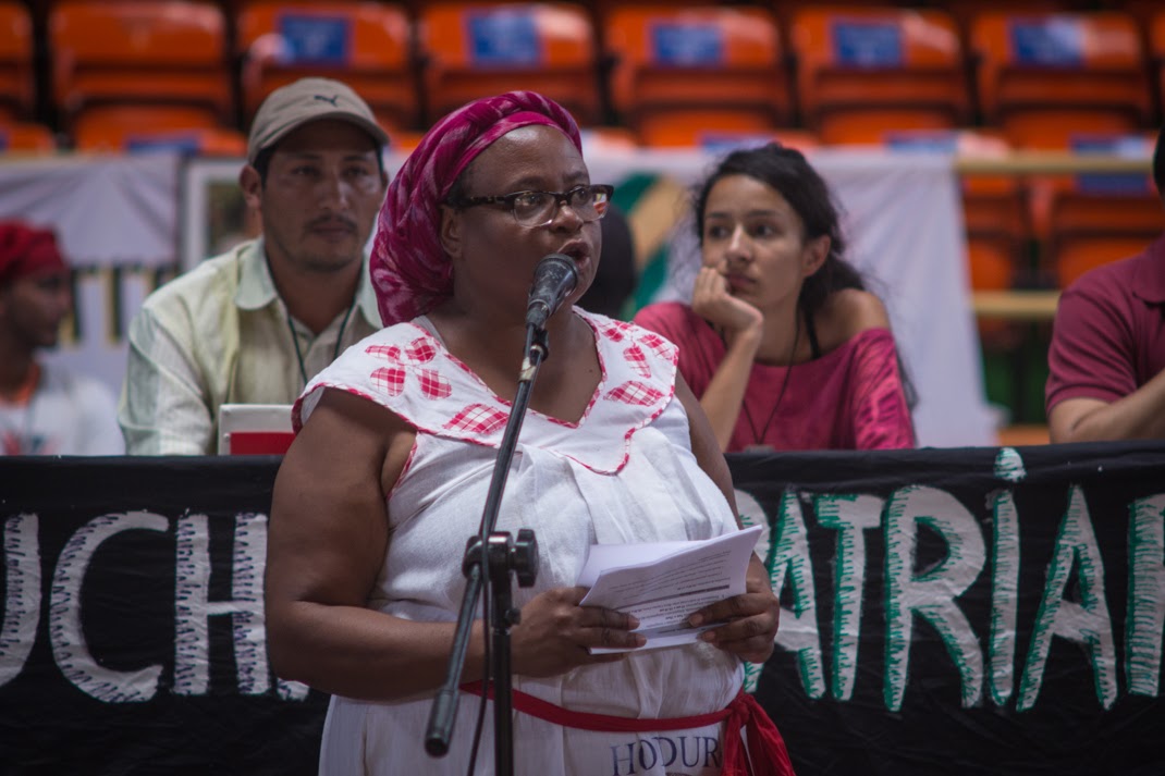 En el momento que se iniciaba una ceremonia de invocación a nuestros ancestros, una lluvia de bombas lacrimógenas lanzadas por elementos de la Policía nacional, creó una estampida entre los manifestantes, en su mayoría mujeres y algunos menores de edad, que se habían movilizado desde sus comunidades en los territorios Lenca y Garifuna.