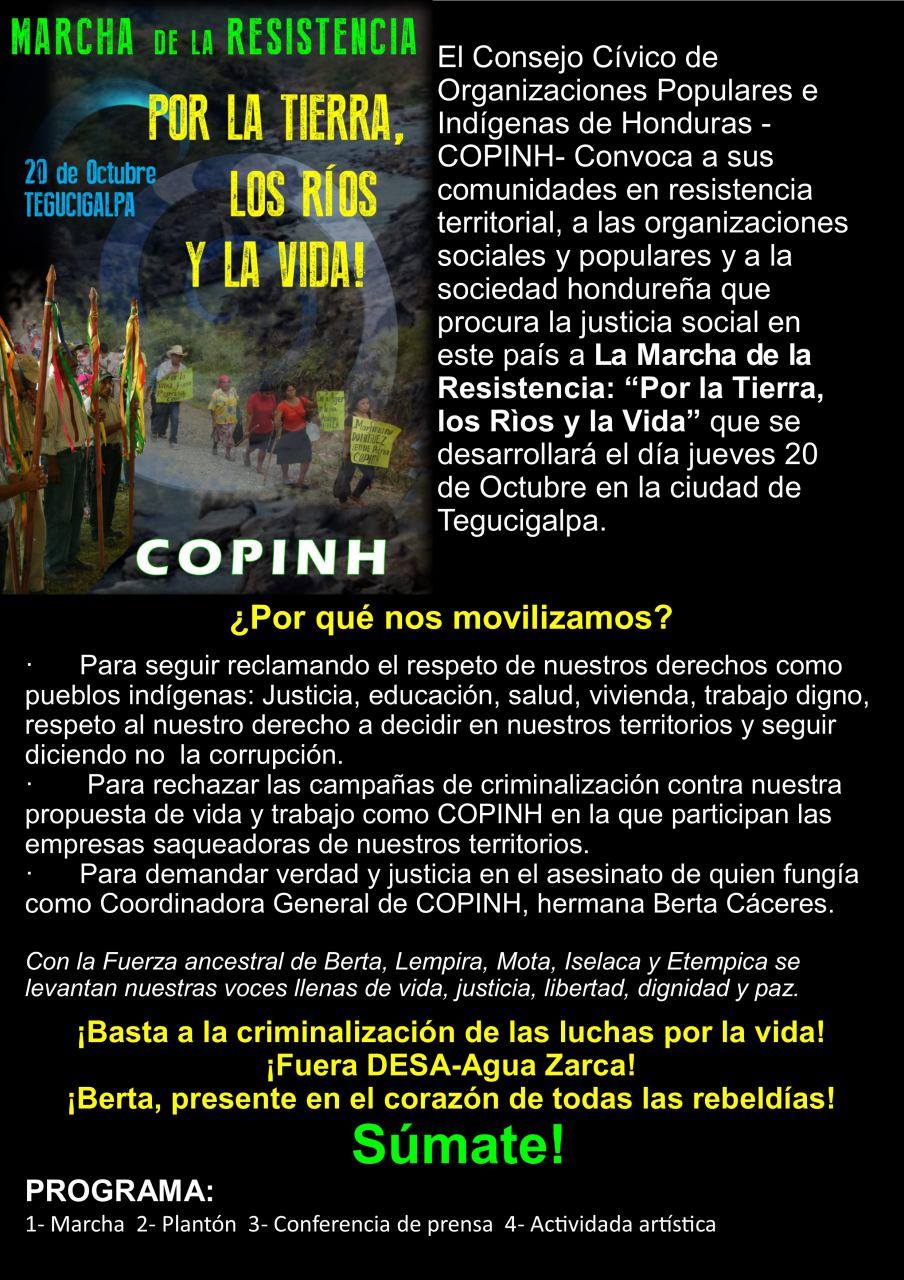 El Consejo Cívico de Organizaciones Populares e Indígenas de Honduras COPINH Convoca a sus comunidades en resistencia territorial, a los organizaciones sociales y populares y a la sociedad hondureña que procura la justicia social en este país a La Marcha de la Resistencia: “Por la tierra,los ríos y la vida” que se desarrollará el día jueves 20 de Octubre en la ciudad de Tegucigalpa.