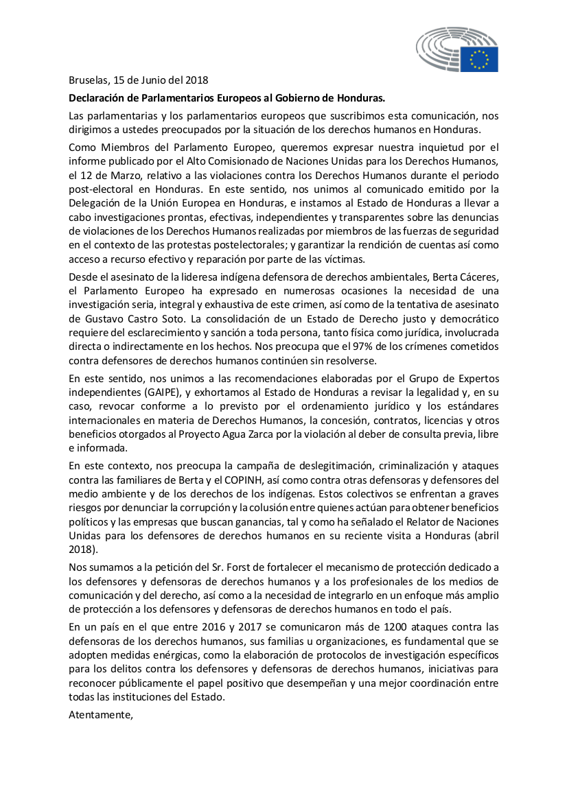 El COPINH saluda con entusiasmo la carta de 50 parlamentarios y parlamentarias del Parlamento Europeo, máximo ente legislador de la Unión Europea, dirigida al gobierno de facto de JOH e instituciones hondureñas de gobierno para que “se revoquen la concesión, contratos, licencias y otros beneficios otorgados al Proyecto Agua Zarca por la violación al deber de consulta previa, libre e informada” en línea con las recomendaciones del informe del grupo GAIPE.
