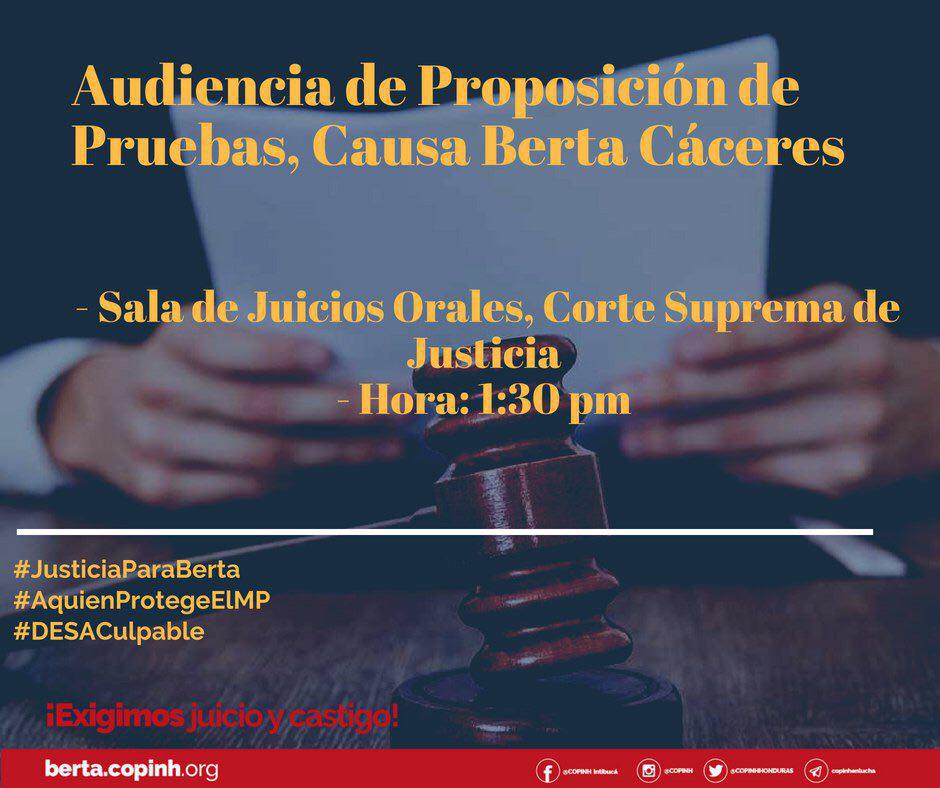 Invitamos a la observación internacional y organizaciones de derechos humanos en Tegucigalpa a acompañarnos este día lunes 3 de septiembre a la audiencia de proposición de pruebas en la causa Berta Cáceres, una de las decisiones que se tomará es la participación de la familia Atala como testigos en el caso.