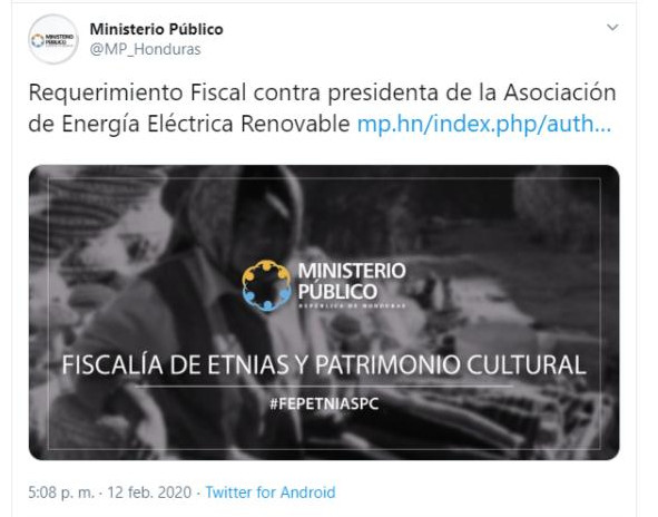 La presidenta de la Asosiación Hondureña de Energía Renovable, Elsia Paz, ha sido denunciada ante el Ministerio Público de Honduras por el delito “de discriminación en perjuicio de líderes del pueblo indígena Lenca”