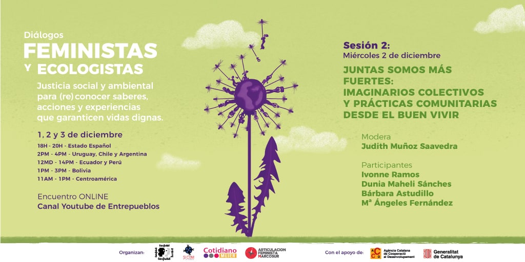Participan: Ivonne Ramos (Acción Ecológica – Ecuador) Dunia Maheli Sánches (COPINH – Honduras) Bárbara Astudillo (Ecofeminista – Provincia de Petorca – Chile) Mª Ángeles Fernández (Pikara Magazine – Estado español)
