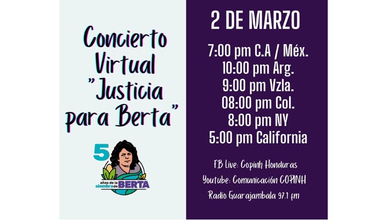 #5AñosJuntoABerta | En el marco del 5to Aniversario del asesinato de nuestra compañera Berta Cáceres te invitamos a nuestro concierto virtual “Justicia para Berta” en honor a todas y todos los mártires asesinadxs y a quienes siguen luchando por defender la vida.