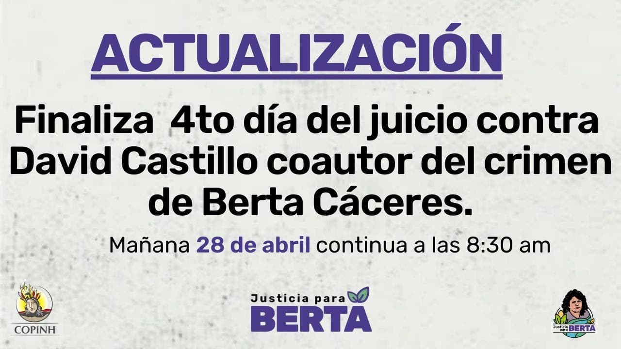 | El juicio continuó con la presentación de la prueba documental del Ministerio Público. Mañana se presentará la prueba testifical por parte del MP, en el que participará nuestra compañera Rosalina Domínguez, quien dará a conocer el contexto de lucha de la comunidad Lenca de Río Blanco y dará fe de los ataque vividos por la reivindicación de sus derechos en defensa del Río Gualcarque. El Tribunal convocó para este miércoles 28 de abril, a las 8:30 am Notas de prensa: El Ciudadano: https://www.elciudadano.com/actualidad/tras-numerosos-aplazamientos-reanudan-juicio-contra-uno-de-los-asesinos-de-berta-caceres/04/27/ TeleSur: https://www.telesurtv.net/news/honduras-reanudan-juicio-berta-caceres-20210427-0010.html?utm_campaign=shareaholic&utm_medium=twitter&utm_source=socialnetwork Resumen diario de la Red Solidaridad con Honduras. Día 4. (inglés) https://www.aquiabajo.com/blog/2021/4/27/day-four-trial-against-david-castillo-co-author-of-berta-cceres-murder |