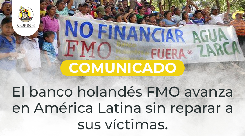 El banco FMO, propiedad en un 51% del Estado de Holanda, financió de 2014 a 2017 al ilegal proyecto hidroeléctrico Agua Zarca, impuesto a la comunidad indígena de Río Blanco. Aportó en conjunto 17.2 millones de dólares (413 millones de lempiras aproximadamente) utilizados para el pago actos de violencia y asesinatos en contra de la comunidad Lenca denunciados por Berta Cáceres y el COPINH; sicarios, ataques directos, persecución, amenazas, sabotajes, actos de corrupción a miembros de la policía y alcaldías locales. Por estos hechos desde el año 2018 el banco enfrenta una demanda civil por negligencia.