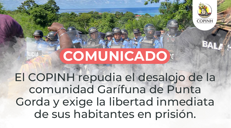 El COPINH repudia las acciones del Poder Judicial de Honduras a través del juzgado de Letras de Islas de La Bahía, junto a la Policía Nacional y el Ejército de Honduras quienes desalojaron con violencia a la comunidad Garífuna de Punta Gorda de su territorio ancestral y detuvieron a 6 personas miembras de la misma.