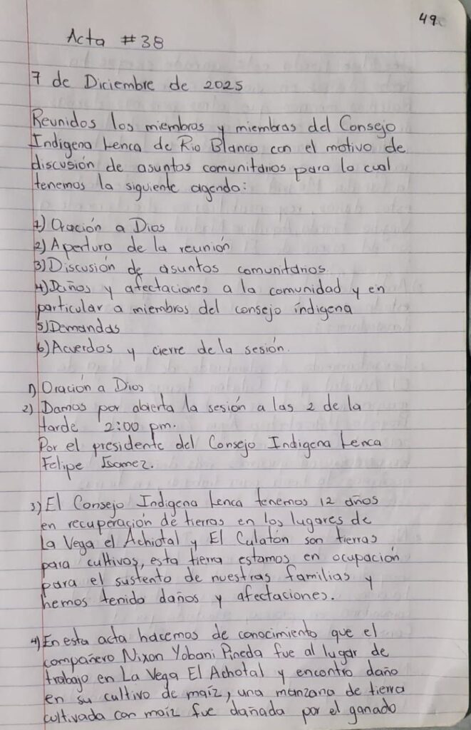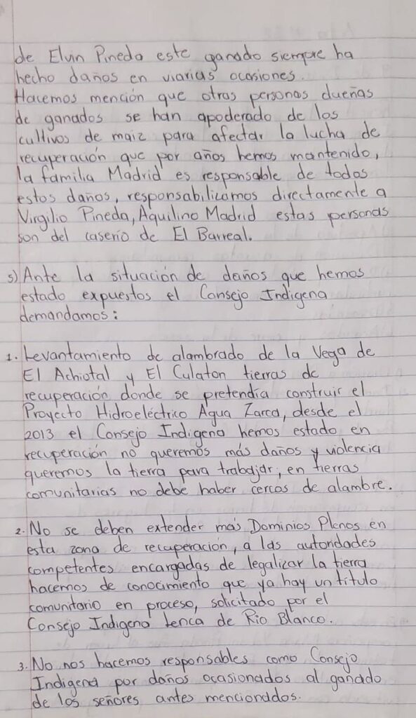 Desde hace 12 años, el Consejo Indígena Lenca mantiene un proceso legítimo de recuperación de tierras ancestrales en La Vega, El Achiotal y El Culatón, en Río Blanco territorios que han sido destinados al cultivo y sustento de nuestras familias.