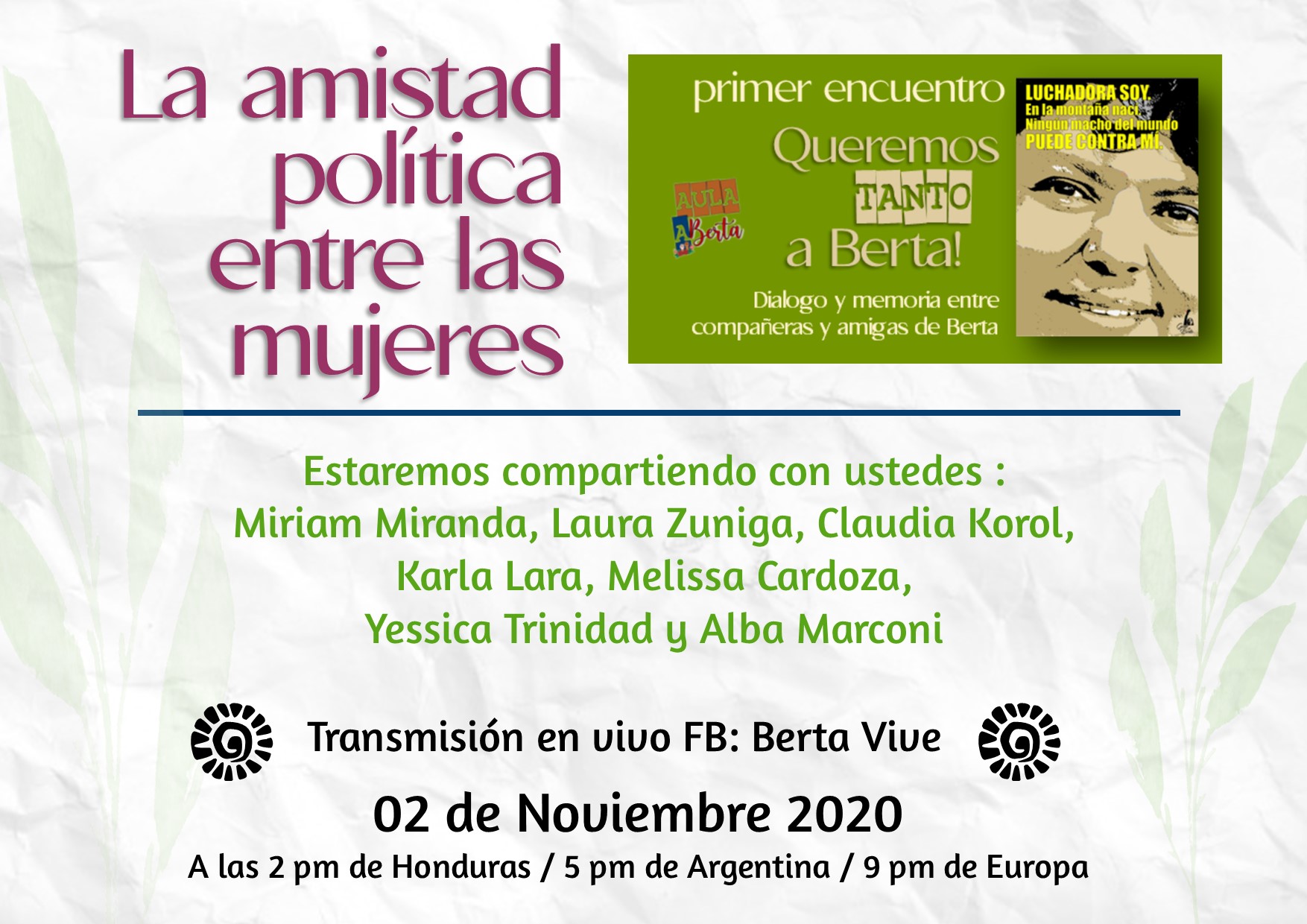 El 2 de noviembre iniciamos Aula ABerta. ¡Queremos tanto a Berta! El diálogo y la memoria colectiva de sus amigas, compañeras. El 2 de cada mes nos seguiremos encontrando a las 2 pm de Honduras, a las 5 pm de Argentina, a las 9 pm de Europa, para pensarla y traerla a nuestras luchas siempre. El primer encuentro: "La amistad…
