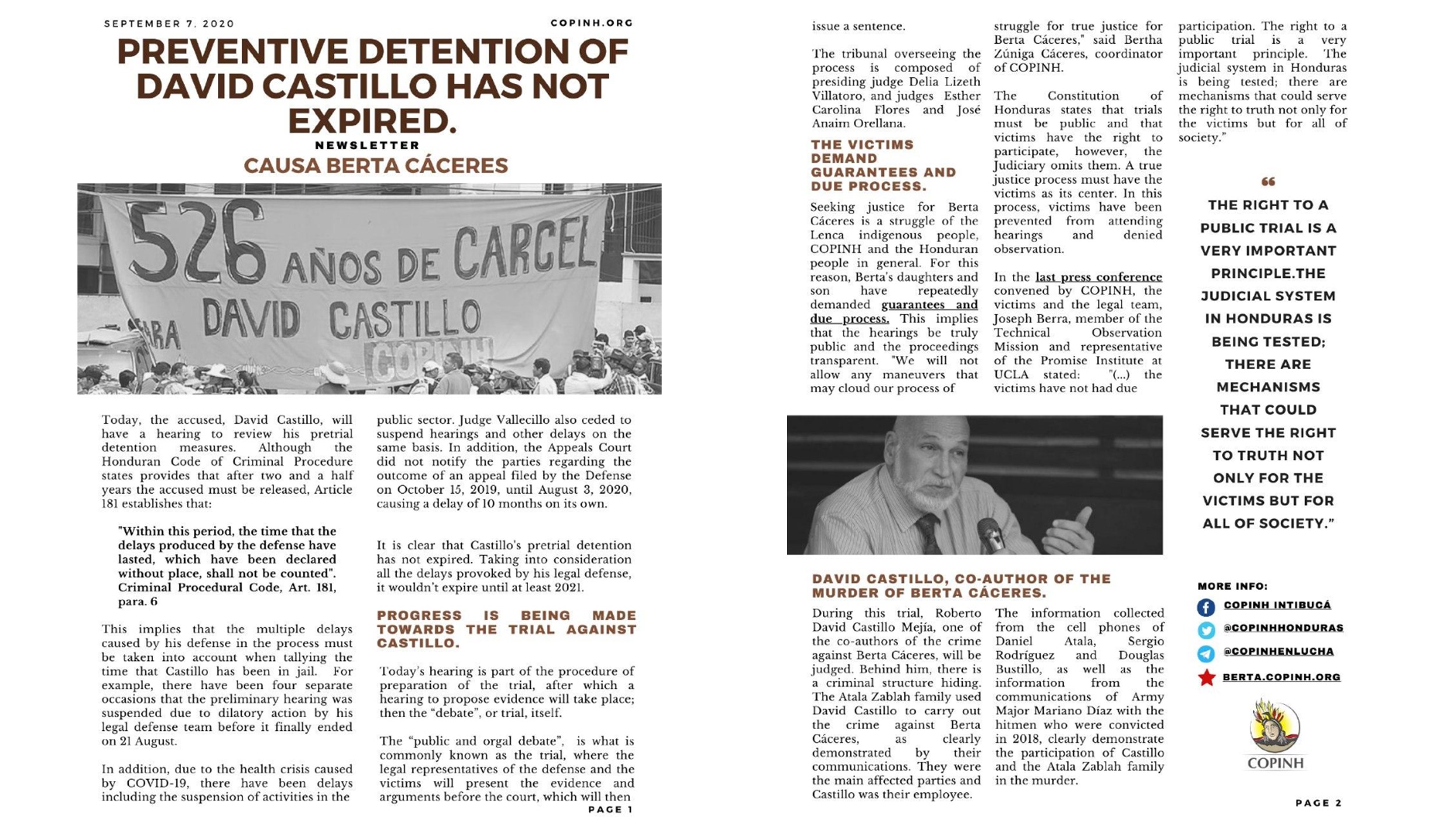 Causa Berta Cáceres (HERE in English) El Consejo Cívico de Organizaciones Populares e Indígenas de Honduras COPINH, junto al equipo legal de la causa Berta Cáceres, a la prensa nacional e internacional. Este día la defensa del señor David Castillo ha presentado una recusación contra el Tribunal de Sentencia que conoce el caso por el asesinato de Berta Cáceres, una…