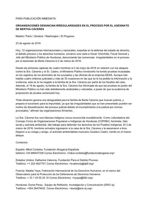 Hoy, 23 de agosto 2018, 12 organizaciones internacionales y nacionales expertas en la defensa del estado del derecho, el debido proceso y los derechos humanos, enviaron una carta a Oscar Chinchilla, Fiscal General y Jefe del Ministerio Público de Honduras, denunciando las numerosas irregularidades en el proceso por el asesinado de Berta Cáceres el 2 de marzo del 2016. …