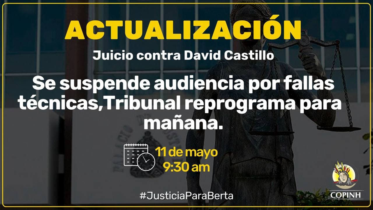 . 6 DE ABRIL: https://copinh.org/2021/04/juicio-contra-david-castillo-dia-1/ https://www.aquiabajo.com/blog/2021/4/6/day-one . . 7 DE ABRIL: https://copinh.org/2021/04/juicio-contra-david-castillo-dia-2/ https://www.aquiabajo.com/blog/2021/4/7/day-two-trial-against-david-castillo-co-author-of-berta-cceress-murder . 26 DE ABRIL: https://copinh.org/2021/04/juicio-contra-david-castillo-dia-3/ https://www.aquiabajo.com/blog/2021/4/26/day-three-trial-against-david-castillo-co-author-of-berta-cceres-murder . 27 DE ABRIL: https://copinh.org/2021/04/juicio-contra-david-castillo-dia-4/ https://www.aquiabajo.com/blog/2021/4/27/day-four-trial-against-david-castillo-co-author-of-berta-cceres-murder . 28 DE ABRIL: https://copinh.org/2021/04/juicio-contra-david-castillo-dia-5/ https://www.aquiabajo.com/blog/2021/4/28/day-five-trial-against-david-castillo-co-author-of-berta-cceres-murder . 29 DE ABRIL: https://copinh.org/2021/04/juicio-contra-david-castillo-dia-6/ https://www.aquiabajo.com/blog/2021/4/29/day-six-trial-against-david-castillo . 30 DE ABRIL: https://copinh.org/2021/05/juicio-contra-david-castillo-dia-7/ https://www.aquiabajo.com/blog/2021/4/30/day-seven-trial-against-david-castillo . 03 DE MAYO: https://copinh.org/2021/05/juicio-contra-david-castillo-dia-8/ https://www.aquiabajo.com/blog/2021/5/3/day-eight-trial-against-david-castillo . 04 DE MAYO: https://copinh.org/2021/05/juicio-contra-david-castillo-dia-9/ https://www.aquiabajo.com/blog/2021/5/4/day-nine-trial-against-david-castillo . 05 DE MAYO (suspendido):…