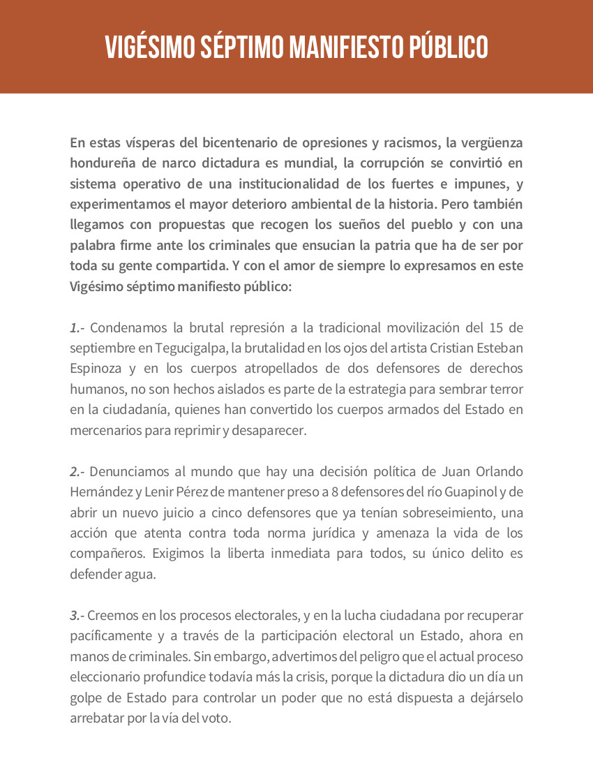 AQUI en Español The Civic Council of Popular and Indigenous Organizations of Honduras - COPINH - to the national and international community expresses the following 1. David Castillo together with the Atala Zablah family, driven by the objective of benefiting economically, created a criminal structure that committed countless crimes–from fraud and corruption for the supposed generation of "renewable" energy, serious…