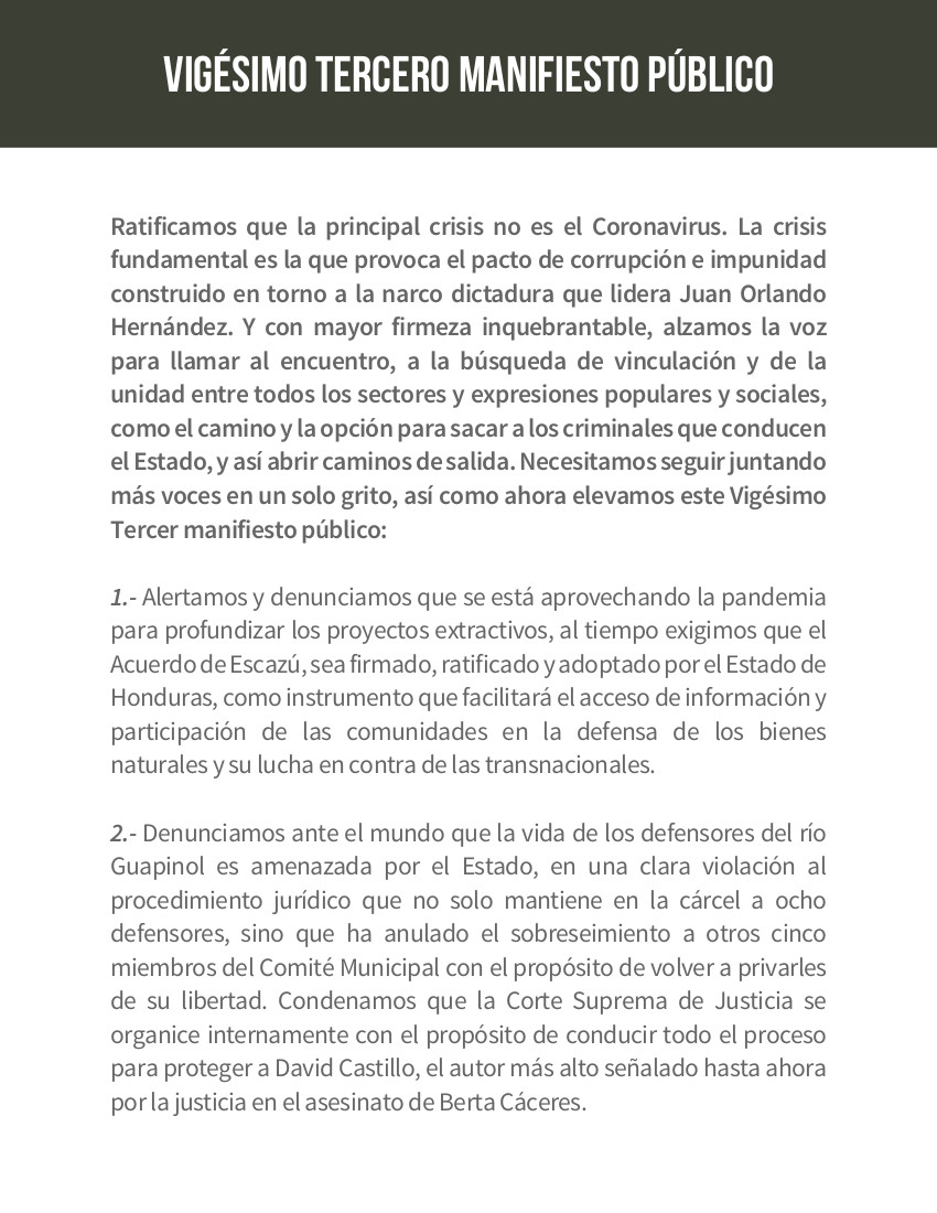 Causa Berta Cáceres (HERE in English) El Consejo Cívico de Organizaciones Populares e Indígenas de Honduras COPINH, junto al equipo legal de la causa Berta Cáceres, a la prensa nacional e internacional. Este día la defensa del señor David Castillo ha presentado una recusación contra el Tribunal de Sentencia que conoce el caso por el asesinato de Berta Cáceres, una…