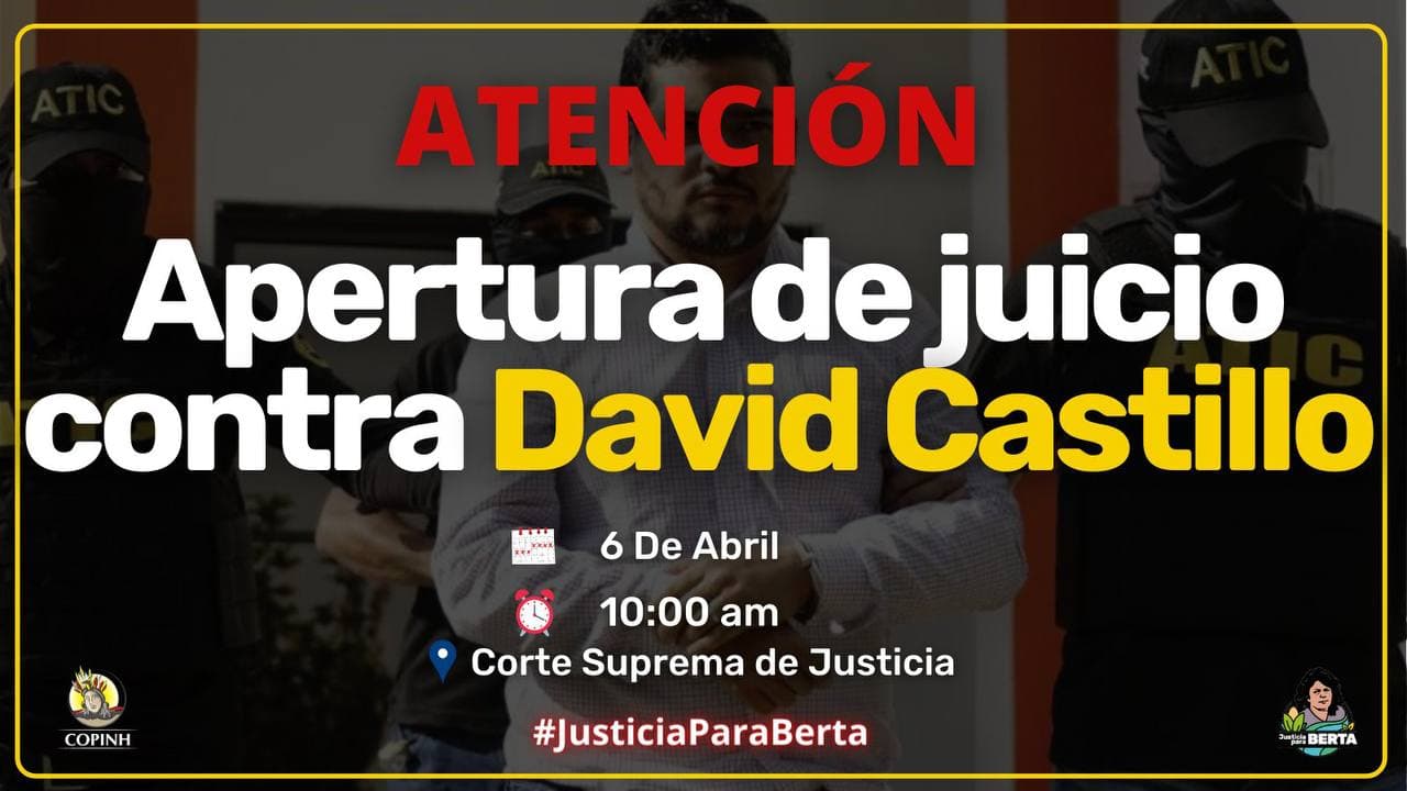 . 6 DE ABRIL: https://copinh.org/2021/04/juicio-contra-david-castillo-dia-1/ https://www.aquiabajo.com/blog/2021/4/6/day-one . . 7 DE ABRIL: https://copinh.org/2021/04/juicio-contra-david-castillo-dia-2/ https://www.aquiabajo.com/blog/2021/4/7/day-two-trial-against-david-castillo-co-author-of-berta-cceress-murder . 26 DE ABRIL: https://copinh.org/2021/04/juicio-contra-david-castillo-dia-3/ https://www.aquiabajo.com/blog/2021/4/26/day-three-trial-against-david-castillo-co-author-of-berta-cceres-murder . 27 DE ABRIL: https://copinh.org/2021/04/juicio-contra-david-castillo-dia-4/ https://www.aquiabajo.com/blog/2021/4/27/day-four-trial-against-david-castillo-co-author-of-berta-cceres-murder . 28 DE ABRIL: https://copinh.org/2021/04/juicio-contra-david-castillo-dia-5/ https://www.aquiabajo.com/blog/2021/4/28/day-five-trial-against-david-castillo-co-author-of-berta-cceres-murder . 29 DE ABRIL: https://copinh.org/2021/04/juicio-contra-david-castillo-dia-6/ https://www.aquiabajo.com/blog/2021/4/29/day-six-trial-against-david-castillo . 30 DE ABRIL: https://copinh.org/2021/05/juicio-contra-david-castillo-dia-7/ https://www.aquiabajo.com/blog/2021/4/30/day-seven-trial-against-david-castillo . 03 DE MAYO: https://copinh.org/2021/05/juicio-contra-david-castillo-dia-8/ https://www.aquiabajo.com/blog/2021/5/3/day-eight-trial-against-david-castillo . 04 DE MAYO: https://copinh.org/2021/05/juicio-contra-david-castillo-dia-9/ https://www.aquiabajo.com/blog/2021/5/4/day-nine-trial-against-david-castillo . 05 DE MAYO (suspendido):…