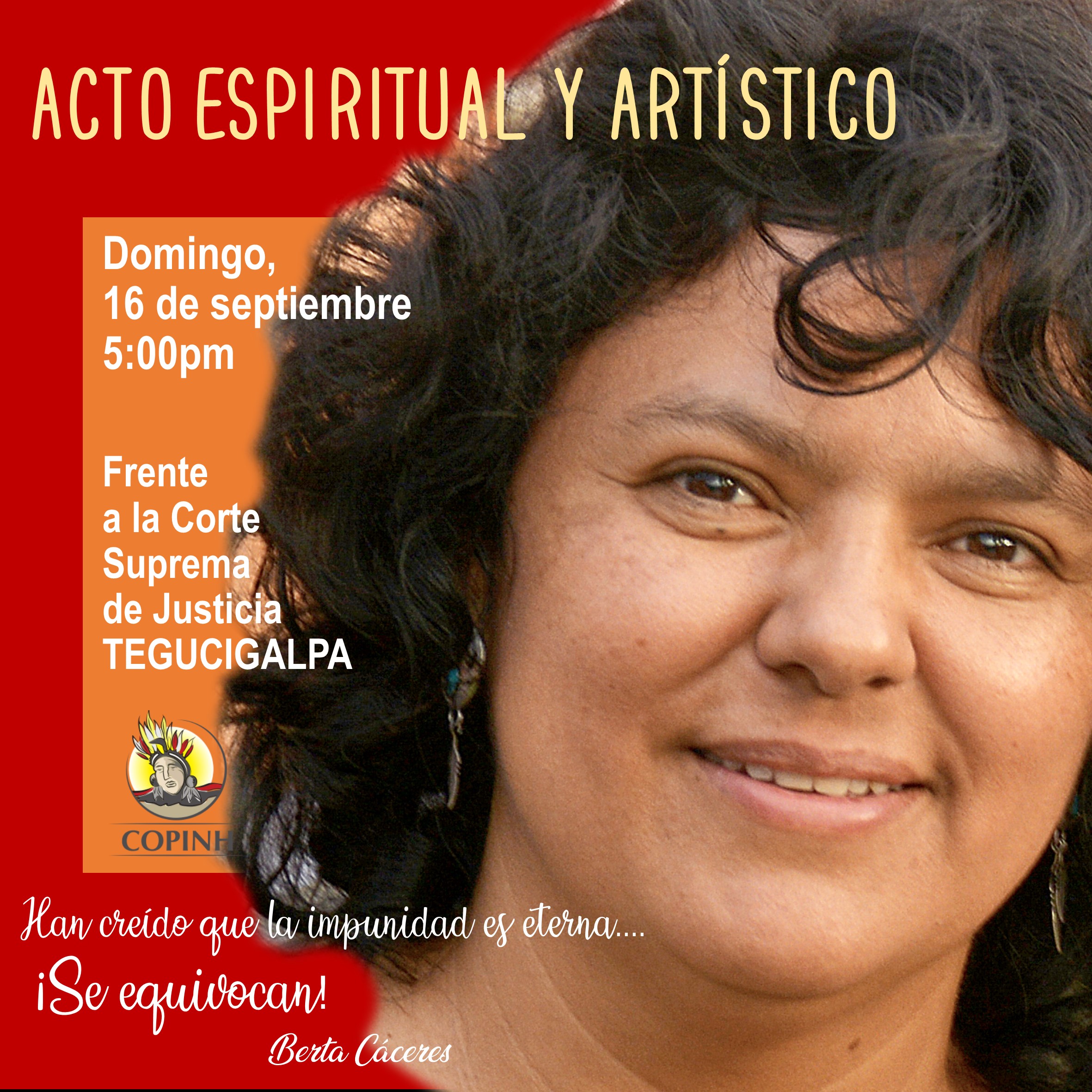 Hacemos la invitación a todos y todas quienes quieran acompañarnos el día de hoy en un acto espiritual y artístico, de cara al inicio del juicio oral y público en la causa Berta Cáceres. Lugar: Frente a la corte Suprema de Justicia Hora: 5:00 pm #JusticiaParaBerta #DESACulpable