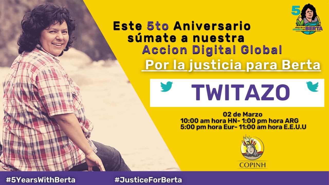 ?Este 2 de Marzo, te invitamos a ser parte de nuestro #Twitazo en exigencia y conmemoración a nuestra compañera #BertaCáceres. 5 años exigiendo la verdadera justicia para Berta y los pueblos. ??Tómate una foto o graba un video en exigencia a la #JusticiaParaBerta no olvides utilizar nuestros hashtags y etiquetarnos. ?#5AñosJuntoABerta