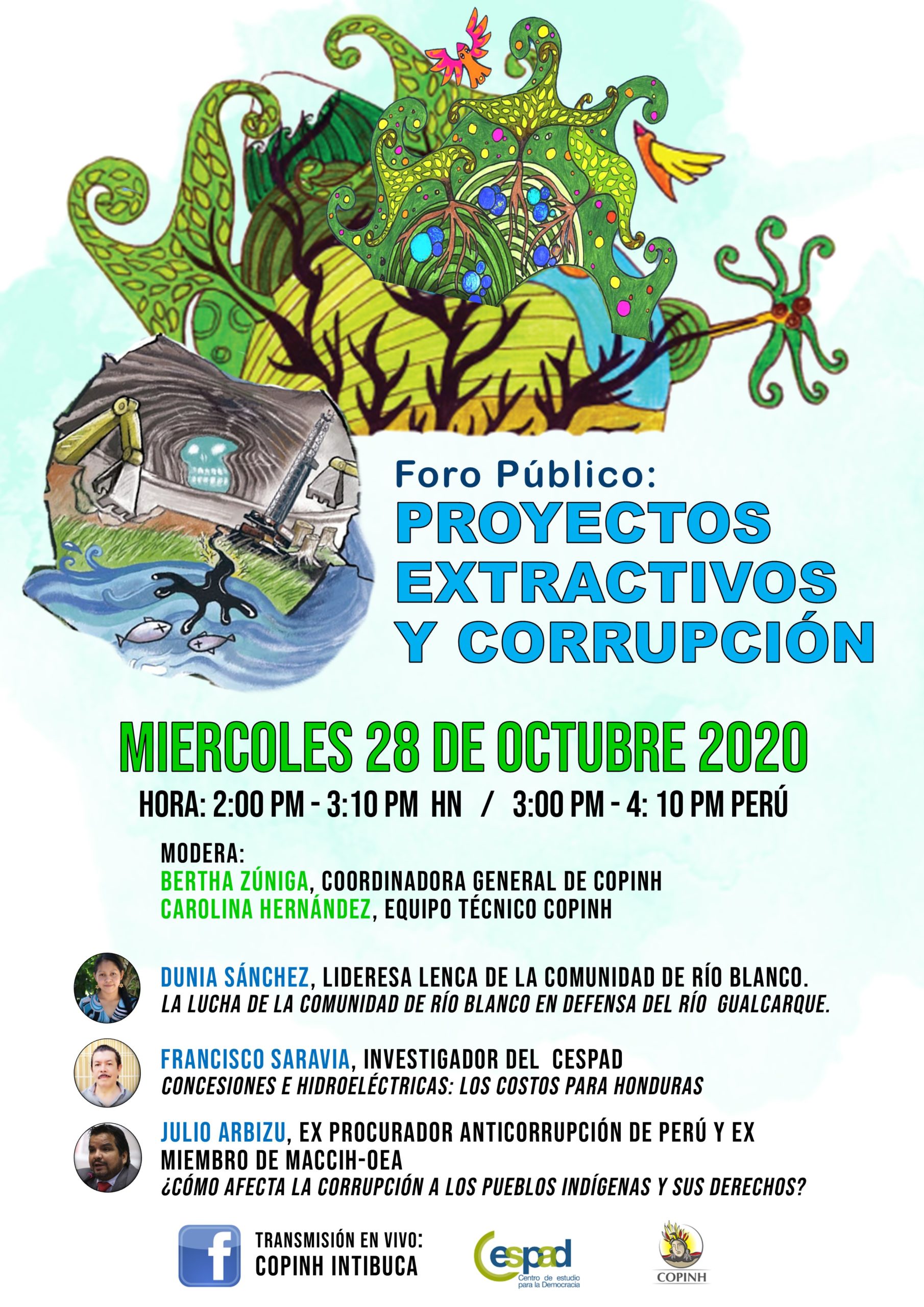 (English below) Este miércoles 28 de Octubre, les invitamos a ser parte de nuestro foro “Proyectos Extractivos y Corrupción”. Objetivo: Visibilizar la corrupción en el modelo de generación de energía en Honduras y las graves violaciones a los derechos humanos de las comunidades indígenas. La imposición ilegal del proyecto Hidroeléctrico Agua Zarca sobre el sagrado Río Gualcarque en la comunidad…