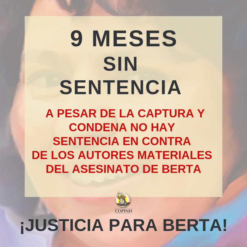 Hace 9 meses que se dictó el fallo oral que condenaba a 7 de los 8 imputados por la autoría material en el asesinato de nuestra compañera Berta Cáceres. Según la ley hondureña 5 días después del fallo oral debiese dictarse la sentencia escrita que garantizaría justicia integral en este caso.