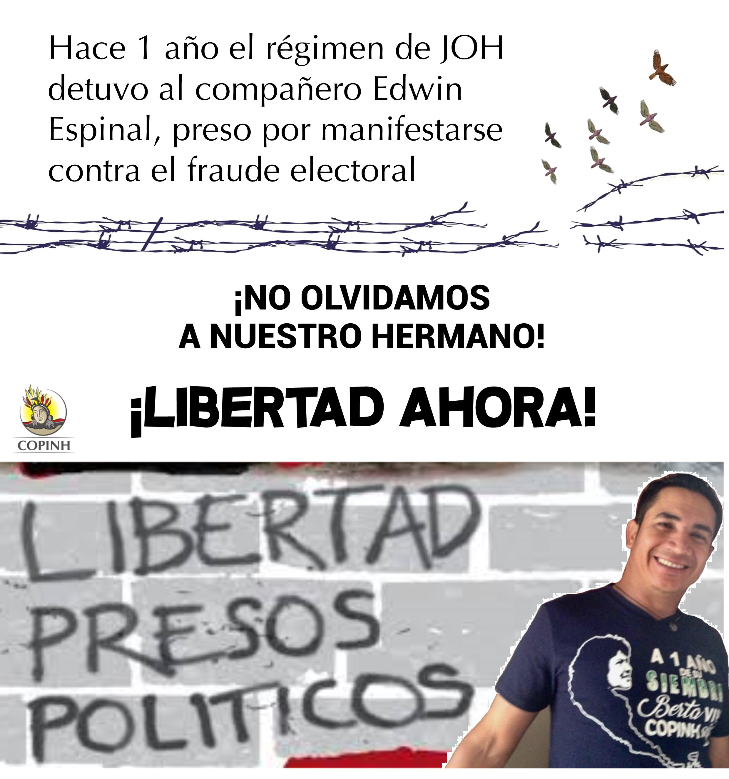 Hace 1 año el régimen de JOH detuvo al compañero Edwin Espinal, preso manifestarse contra el fraude electoral ¡No olvidamos a nuestro hermano! ¡Libertad ahora! ¡Libertad a los presos políticos! #LibertadEdwinEspinal