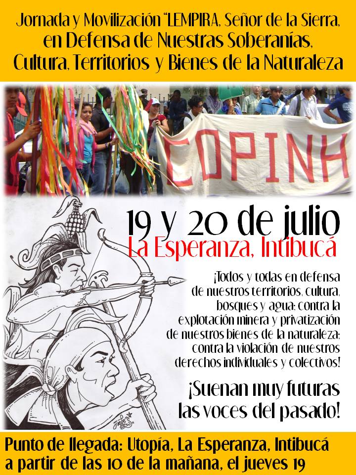 El COPINH, al conmemorar la gesta histórica de nuestro héroe Lenca, Lempira, convoca a las comunidades a participar este próximo 19 y 20 de julio a la Jornada y Movilización “LEMPIRA, Señor de la Sierra, en Defensa de Nuestras Soberanías, Cultura, Territorios y Bienes de la Naturaleza”, que se llevará a cabo en el Centro de Encuentros y Amistad Utopía…